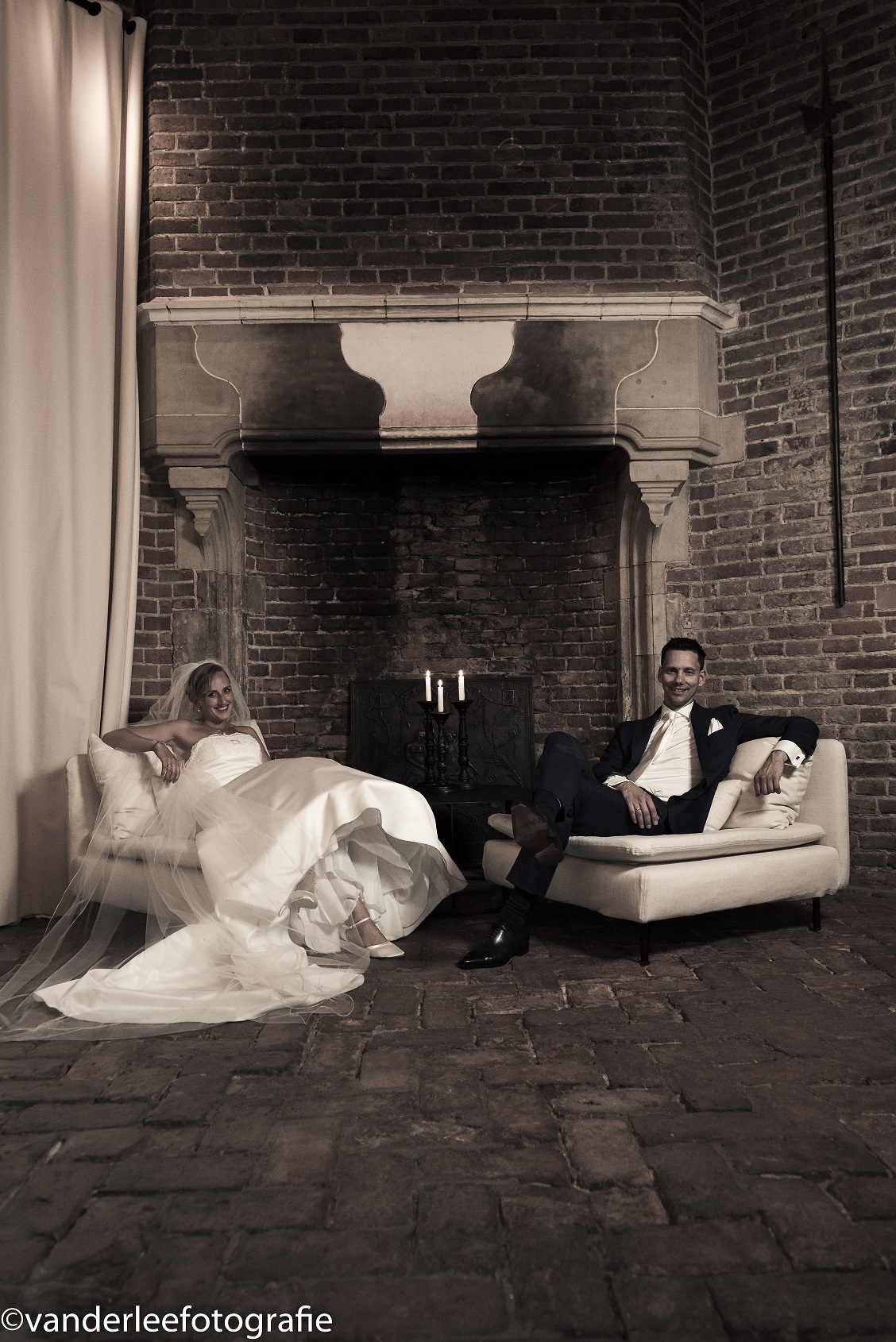 Het stel maakte volop gebruik van de vele ruimten in het kasteel. ,,We hebben de huwelijksceremonie in het prieel in de kasteeltuin gehouden, aansluitend hebben we met 75 daggasten geborreld en gebarbecued op de binnenplaats en tijdens het feest ‘s avonds konden de gasten zelfs kiezen uit dansen op de tweede verdieping of loungen op derde. Al onze wensen zijn goed opgepakt en uitgevoerd. Het was een perfecte dag.”